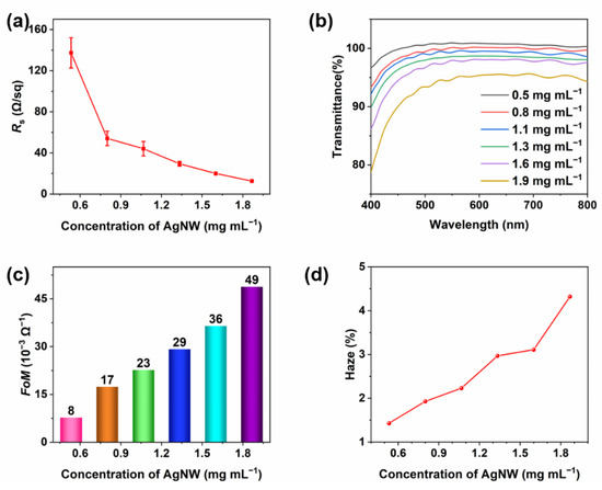 Optoelectronic properties of the AgNW film produced at different AgNW concentrations: (a) the Rs of the AgNW films; (b) the transmittance of the AgNW films from 400 to 800 nm; (c) the FoM; (d) the haze values of the AgNW films.