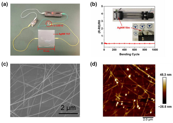 (a) The photograph of AgNW TCF (15 cm × 15 cm) connected in series with a power supply, LED, switch, and wires. (b) Variations in resistance of the optimized AgNW TCF during repeated bending test. (c) SEM morphology of the optimized AgNW TCF (d) AFM image of the optimized AgNW TCF.