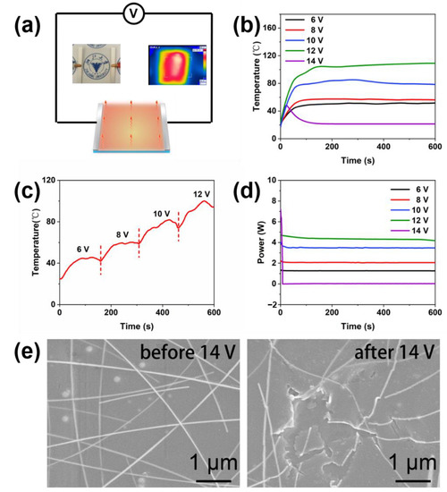 (a) The schematic illustration and the infrared image of the AgNW film heater (5 cm × 5 cm). (b,c) Temperature-time profile at different applied voltages. (d) Power-time profile at different applied voltages. (e) SEM images of the AgNW heater before and after an applied voltage of 14 V.