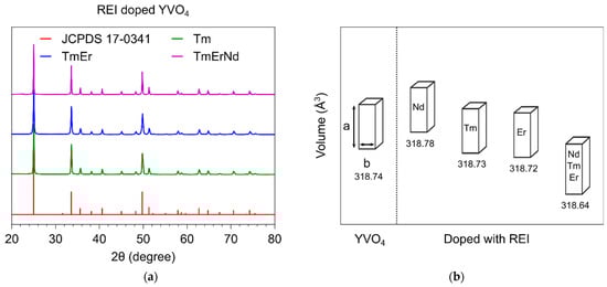 (a) XRD patterns and (b) unit cell volume of the YVO4 samples doped with different rare earth ions.