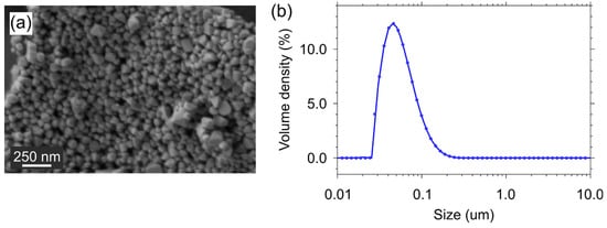 Figure 2 demonstrates the morphology and the size distribution of the prepared particles. According to the SEM images (Figure 2a), the individual particles (with the size that rarely exceeds 100 nm) often possess an octahedral shape, which differs from that of the previously synthesized particles and is due to the higher volume of the salt melt (KCl) during the second stage of the heat treatment. This is also confirmed by the results of the SLS (Figure 2b) of the YVO4 powder in the aqueous solution. The experimental results propose a unimodal distribution of the particles with the average size of ~50 nm.