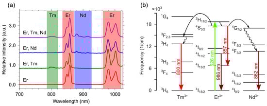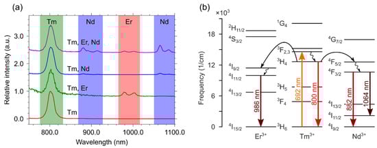Figure 6a displays the emission spectra of all samples containing thulium ions. The emission spectrum of the single-doped YVO4:Tm3+ (1 at.%) sample demonstrates a strong 3H4 − 3H6 (800 nm) transition. The introduction of the second ion (Er3+ or Nd3+) in the structure leads to the appearance of characteristic lines of the corresponding ion, namely 4S3/2 − 4I13/2 (857 nm) and 4I11/2 − 4I15/2 (986 nm) transitions for Er3+ and 4F3/2 − 4I9/2 (882 nm) and 4F3/2 − 4I11/2 (1064 nm) transitions for Nd3+. Since we selectively excite (λex = 692 nm), this indicates a strong energy transfer between the active ions in the double-doped samples. Similarly, the triple-doped sample shows emission bands attributed to all three ions. Based on the analysis of the luminescence spectra for single-, double- and triple-doped samples, we suggest an energy transfer scheme following the direct excitation of Tm3+ (Figure 6b).