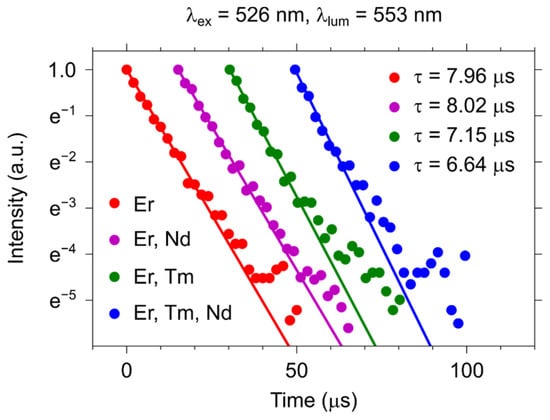 Figure 5 shows the decay curves of erbium-containing samples monitored at the erbium 4S3/2 − 4I15/2 transition (λem = 553 nm, λex = 526 nm). It is noteworthy that the luminescence decay curves started from 50 μs, but for the clear representation of the data, we shifted some datasets along the x-axis. The experimental data were fitted by a single exponential function: , where τ is the observed lifetime of the 4S3/2 level. Due to the energy transfer in the double- and triple-doped samples, the luminescence lifetime decreases from 7.96 ± 0.13 µs (YVO4:Er3+) to 7.15 ± 0.15 µs (YVO4: Er3+, Tm3+) and 6.64 ± 0.20 µs (YVO4:Nd3+, Er3+, Tm3+). We do not observe a decrease in the lifetime for the YVO4: Er3+, Nd3+ sample due to the low concentration of Nd3+.