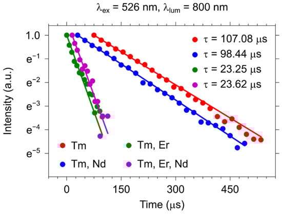 In Figure 7, we show the luminescence lifetimes of the YVO4 particles doped with Tm3+ and other REI monitored at the thulium 3H4 − 3H6 transition (λem = 800 nm) under direct excitation (λex = 692 nm). Unlikely to the Er3+ lifetime, the addition of a small fraction of Nd3+ ions leads to a noticeable variation in the 3H4 lifetime (~9%). However, the presence of Er3+ ions in the double- and triple-doped samples drastically accelerates the quenching of the transition, and the lifetime reaches almost 23 µs for both cases. This fact is probably explained by a low energy mismatch of the Tm3+ and Er3+ excited levels, which results in an efficient Tm3+ − Er3+ energy transfer.