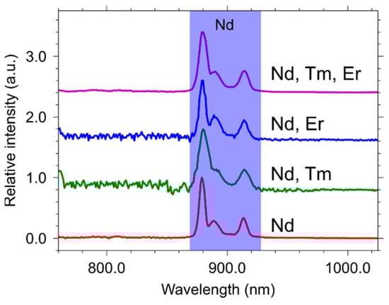 The emission spectrum of the single-doped YVO4: Nd3+(0.03 at.%) sample displays peaks assigned to the 4F3/2 − 4I9/2 transition (882 nm). The same emission lines are observed in the double- and triple-doped samples (Figure 8). The low concentration of neodymium in combination with the low energy transfer efficiency could explain the absence of erbium and thulium lines in the emission spectra when neodymium is directly excited.