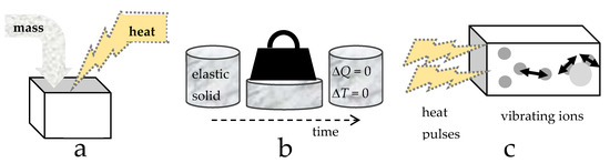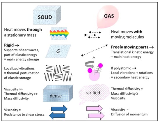 Constructs for heat storage in gas and solids must each account for differences in the types of energy stored, plus restrictions on converting energy between the different reservoirs. Crucially, for solids, heat transfer is independent of mass diffusion, as shown by Hofmeister and Criss [9]. Heat may be stored in the cyclical and microscopically localized vibrations of interatomic bonds in solids, but its transport across the solid does not involve net displacement of the atoms or deformation of their structural arrangement. Moreover, the vibrations cannot be the main energy reservoir of the solid because these constitute perturbations of the atoms from their static positions. Geometrical constraints limit average displacements to circa interatomic distances. These behaviors stem from solid matter’s strength and hallmark characteristic of rigidity (Figure 1). Solids deforming under shear stress greatly contrasts with behavior of gases, which flow under any stress and in which heat moves with the translations of its molecules. Thus, energy in a solid is essentially potential (stored) energy, whereas much of the energy in a gas is kinetic (translational) energy. For monatomic gas, all energy is translational.
