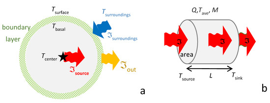 Schematics of conditions: (a) Spherical symmetry, which also applies to radial flow in a very long cylinder. Matter (grey circle) emits heat in accord with its temperature (orange squiggle arrow), but emissions are actually sampled from a surface boundary layer (stippled green shell). Constant flux is maintained either by a source (star) and/or externally (blue arrow); (b) Longitudinal flow in Cartesian (or cylindrical) symmetry. At steady state, flux along the special direction is a constant that is independent of position, so the axial thermal gradient is independent of time, and perpendicular slices are isothermal.