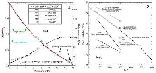 - Schulte, O.; Holzapfel, W. Equation-of-state behavior for different phases of lead under strong compression. Phys. Rev. B 1995, 53, 12636–12639. [Google Scholar] [CrossRef] [Green Version]