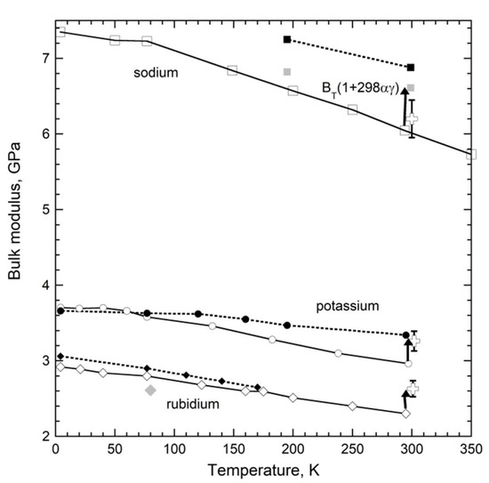 - Anderson, M.S.; Swenson, C.A. Experimental compressions for sodium, potassium, and rubidium metals to 20 kbar from 4.2 to 300 K. Phys. Rev. B 1983, 28, 5395–5418. [Google Scholar] [CrossRef]