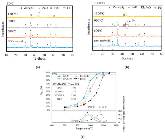 Carbothermic reduction of EAFD/SMS (ED-MT3) and EAFD/Coke (ED-C) composite samples with molar C/O = 0.8. (a) XRD patterns of ED-C samples interrupted at 600 °C, 900 °C, and 1100 °C during reduction process; (b) XRD patterns of ED-MT3 samples interrupted at 600 °C, 900 °C, and 1100 °C during the reduction process; (c) The upper curves showed the degree of zinc removal (%) defined in Equation (1) and the lower curves showed zinc recovery rate (dDZn%/dTemp.). The recovery rate is defined as the derivative of upper curve, which is the derivative of the degree of removal with respect to temperature. The results show that the EAFD/SMS composite samples have the maximum recovery rate at about 950 °C, while the EAFD/C sample is about 1150 °C. This observation quantitatively suggests that SMS as a reducing agent (in place of coke) can lower the reduction temperature by about 200 °C.