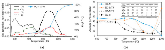 (a) Different types of gases vaporized or dissociated from volatile matter (VM) of SMS which was heated from 300 to 1200 °C at the rate of 20 °C/min in inert gas; for comparison, the degree of Zn removal (DZn, %) is also plotted. (b) Changes in mean pore size in the carbothermic reduction process from 600 °C to 1300 °C of samples with C/O ratio = 0.8.
