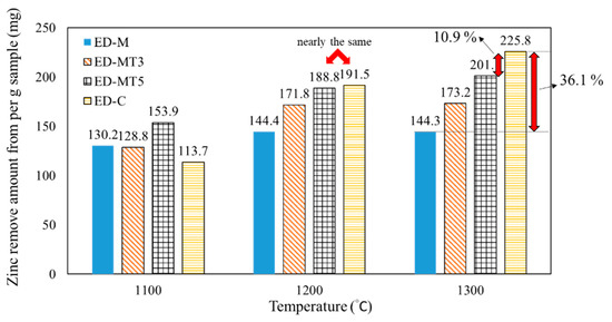 For the series of samples with different torrefaction parameters (ED-M, ED-MT300, and ED-MT500), the effect of torrefaction on Zn removal can be compared with the carbothermic reduction at 800 °C to 1200 °C, and the ED-M (un-torrefied) sample exhibited higher Zn removal than ED-MT3 and ED-MT5 samples (pretreated with torrefaction). The degree of Zn removal of the ED-MT3 sample was slightly higher than that of the ED-MT5 sample, but the difference was negligible. In other words, the main effect of torrefaction on SMS is an increase in fixed carbon ratio.