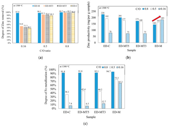 According to literature reports, the reduction of ZnO starts at around 800 °C, which is lower than that of Fe2O3 at around 1000 °C, which means that C reduces Zn first. If the amount of C is insufficient, this phenomenon will significantly affect the reduction of Fe2O3 (as shown by the ED-MT3, ED-MT5, and ED-C samples with C/O less than 0.5 in Figure 4c). Nevertheless, the above results also indicated that the ED-M samples with high VM content were able to maintain the relatively favorable degree of Fe metallization (approximately 65% with C/O = 0.16) promoted by VM. However, the recycling of Fe requires a C/O ratio of 0.8 to achieve high degree of Fe metallization over 90%. If the simultaneous recycling of Zn and Fe in EAFD is to be considered, ED-MT5 with C/O = 0.8 is recommended to achieve a high reduction degree and high productivity of Zn and Fe.