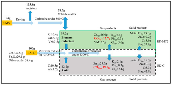 Material flow analysis of ED-MT5 and ED-C as EAFD reducing agents (C/O = 0.8, 1300 °C) and their effects on carbon emissions. Under almost the same Zn products, biomass samples produced less CO2 than coke samples. Besides, the biomass reductant showed the potential for extra carbon-reducing according to the assumption of carbon neutrality. Taiwan needs to process 120,000 tons of EAFD annually. If this method is adopted, 23,000 tons of CO2 emissions will be reduced, creating a channel to process 230,000 tons of SMS annually.
