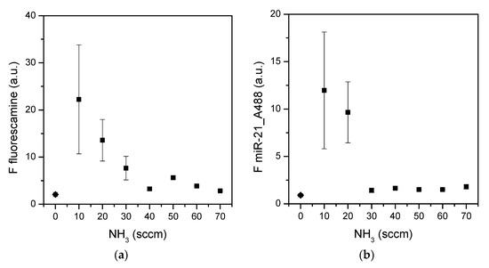 As mentioned, some of the results were due to plasma-functionalized surfaces using binary mixtures of gases. In this case, the increment in NH3 concentration did not result in an increase in amino nitrogen on the surfaces or in miR-21 adsorption (see triangles in Figure 9). On the contrary, the best adsorption properties were observed for surfaces prepared with 10 or 20 sccm of NH3, with a certain degree of variability among the different surfaces, as evident from the standard errors reported in Figure 9. Additionally, these surfaces could have interesting applications in the context of biomarker capture and analysis, suggesting a possible direction for further studies.
