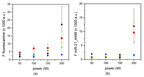 The analysis of surfaces reported in the previous paragraph revealed that amino groups were present principally on surfaces prepared at lower NH3 flow rates. Four conditions, i.e., 10, 20, 30, and 40 sccm of ammonia, were selected to evaluate a possible increase in the deposition of coatings with amino groups by varying the input power. Surfaces were characterized with XPS for the presence of amino groups (Table 3) and with the fluorescence tests for the availability and functionality of these surfaces (Figure 2). The presence of amino groups quantified by XPS was higher on surfaces prepared at the lowest NH3 flow rates (i.e., 10 and 20 sccm) and at higher power values, confirming the data obtained at fixed power (Table 2). For the experiments described in the previous paragraph, both the fluorescamine assay and the functional test with miR-21 demonstrated that the best performances were achieved for surfaces with higher amounts of amino groups, i.e., those prepared at 200 W with 10 or 20 sccm of NH3.