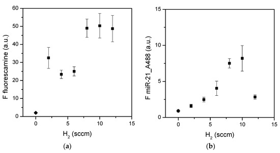 Fluorescamine assay (a) and miR-21 adsorption (b) on plasma-coated surfaces in the ternary CH4/NH3/H2 gas feed. Fluorescence data (squares) are reported as a function of the H2 concentration. Diamonds near zero represent control fluorescence measured on pure silicon surfaces. Data are means of at least three surfaces; standard errors are reported (n ≥ 3).