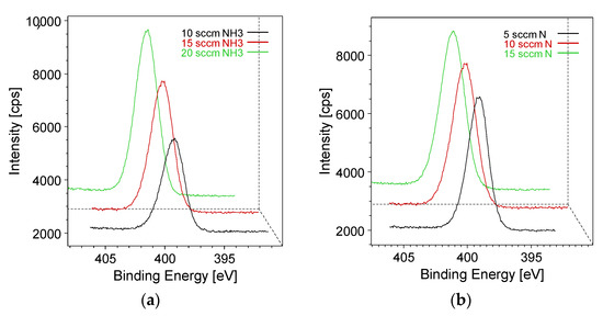 This trend is even more evident when looking at the N spectra (Figure 5) both as a function of the NH3 flow rate (Figure 5a) and as a function of the N2 flow rate (Figure 5b).