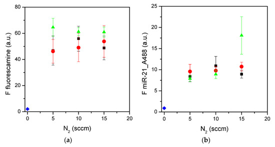 Fluorescamine assay (a) and miR-21 adsorption (b) on surfaces plasma-coated using CH4/NH3/H2 mixtures. Fluorescence data are reported as a function of the N2 flow rate. Black squares refer to 10 sccm NH3, red circles to 15 sccm, and green triangles to surfaces prepared with 20 sccm of NH3. Blue diamonds near zero represent control fluorescence measured on pure silicon surfaces. Data are means of at least three surfaces; standard errors are reported (n ≥ 3).
