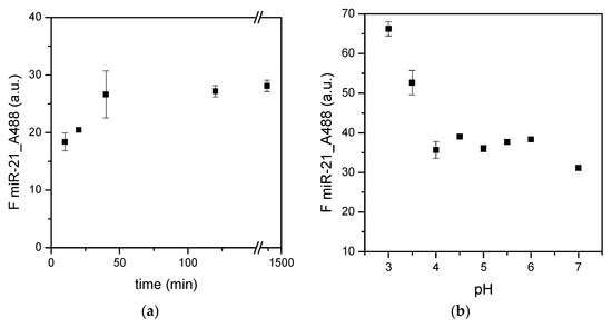 Another parameter that deserved to be investigated in more detail was the pH of the microRNA incubation. As mentioned above, in all tests presented in this work, synthetic miR-21 was dissolved in water and incubated in an unbuffered environment, which was slightly acidic due to the RNA molecules. Here, the range of pH from 3 to 7 was explored by incubating the same amounts of the fluorescently labeled miR-21 (Figure 7b). The fluorescent dye conjugated to miR-21 is stable in the pH range of 4–10, as declared by the producer [48]. Therefore, the fluorescence levels of known amounts of miR-21_A488 were measured at different pH values with a spectrofluorimeter, in particular at lower acid pH; the results of the experiment reported in Figure 7b were normalized with these values.