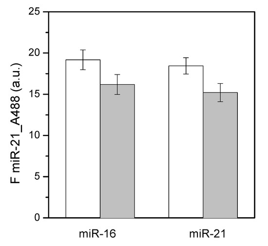 Synthetic miR-16 conjugated with the same fluorescence dye was incubated on the surfaces in the same conditions as miR-21. A similar amount of miR-16 was captured by surfaces (Figure 8), indicating that no specificity for a selected RNA sequence was present, in agreement with previous results [42,51]. Surfaces amino-functionalized by plasma treatments could, therefore, be considered suitable for biomarker microRNA capture.