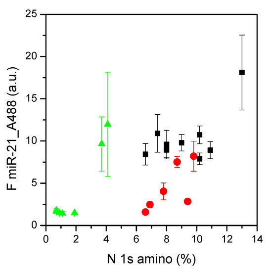 Correlation between miR-21 adsorption and amino nitrogen N 1s XPS components on all surfaces tested. Green triangles refer to surfaces prepared with CH4/NH3 gas feed, red circles to surfaces prepared with the CH4/NH3/H2 feed, and black squares to surfaces prepared with the CH4/NH3/N2 feed. Data are means of at least three surfaces; standard errors are reported (n ≥ 3).