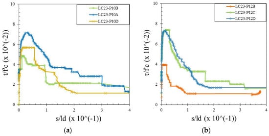 The rebar diameter also influences the bond strength. Based on the presented data in Figure 11, the bond strength tended to increase with the increasing bar diameter, especially between the 10 mm versus 16 mm rebar diameter embedded in the LC20, LC23, and LC26 PWCAC. The 12 mm rebar diameter gave a lower bond strength for the LC20 and LC23 PWCAC, probably due to the placement of the LVDT sensor, which was not rigidly supported as this concrete group was the first tested. This result is different from previous studies, where a smaller bar diameter can provide a higher strength [42,43,44,45]. However, in this study, the 12 mm and 16 mm diameter of the plain rebar embedded in the LC26 concrete showed a better bond strength than the 10 mm bar diameter. These results are in line with those of Liu et al. [13], who stated that the bond strength increases with the increasing diameter of the reinforcement embedded in lightweight concrete.
