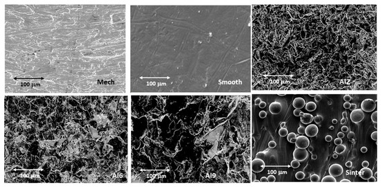 Figure 2 shows the studied surfaces observed by electron microscopy. From this figure, it can be seen that the values with the lowest roughness were the polished samples, and an increasing roughness can be seen as the size of the abrasive alumina particles used in the sandblasting process increased. Small abrasive particles (i.e., Al2) produced Ra ≈ 2.02 μm, whereas other particle sizes (i.e., Al6 and Al9) obtained Ra ≈ 4.21 and 7.10 μm. Likewise, the surface of the sintered samples could be observed on the Ti6Al4V surface, showing that the welding processes of the spheres were not very severe, as they maintained the morphology of the spheres at approximately 80% of the initial volume of each sphere. In this case, the roughness was higher than 14 μm. The roughness values obtained are shown in Figure 3, where all the surfaces presented statistically significant differences between them with a p < 0.01.