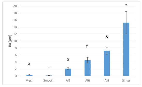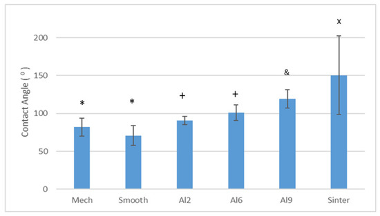 Contact angles obtained by each treatment. Each symbol means that the results were different with statistical significance to the other symbols at p < 0.01. The contact angles of the Sinter and Al9 samples showed statistically significant differences between all other surfaces. The Mech and Smooth samples did not show significant differences between them, but they did show significant differences between all the other samples. The same was true for the Al2 and Al6 samples, which did not differ statistically from each other but did differ from the rest of the samples.