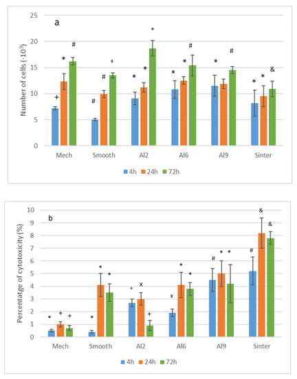 Analysis of cell viability onto the different micromachined and reference surfaces at 4, 24 and 72 h: (a) WST-1 cell proliferation tests; (b) released LDH activity demonstrated that cytotoxic effects were less than 10% of the positive control for all the tested surfaces in all the times analyzed. Each symbol means that the results for each time were different with statistical significance to the other symbols at p < 0.01. The statistical study was carried out for the six types of surfaces for the three times studied. The differences were established for each time.