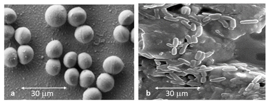 Samples were observed by scanning electron microscopy to determine if bacteria adhered onto the different Ti6Al4V surfaces. Figure 7a shows the usual morphology of “necklace of pearls” of Streptococcus sanguinis; this shape demonstrates the adhesion onto the Ti6Al4V surface. The observed size of the bacteria ranged from 0.7 to 2.2 micrometers in diameter. It is common for two Streptococcus sanguinis to join at the hemispheres, but they do not form large clusters or colonies as is the case with Lactobacillus salivarius. For this strain, the “number” of bacteria was higher on all surfaces studied in comparison with Streptococcus sanguinis. Moreover, Lactobacillus salivarius showed the same configuration on the different surfaces, and small agglomerations and short chains were observed (Figure 7b). The size of the Lactobacillus rods was smaller than for Streptococcus sanguinis with values of 0.4 to 1.2 micrometers in length of the major axis. The morphologies of both bacterial species were not modified by topography.