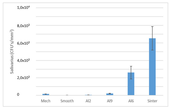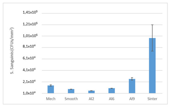 An evaluation of colony forming units (CFUs) per square millimeter (p < 0.005) can be observed in Figure 8 and Figure 9. The two bacteria strains showed a lower tendency to adhere on the Smooth (Lactobacillus salivarius ~4.27 × 101/mm2, Streptococcus sanguinis ~8.02 × 103/mm2) rather than rougher surfaces. However, on the rougher surfaces (e.g., Al2), fewer bacteria attached on the two bacteria strains studied (Lactobacillus salivarius ~9.73 × 101/mm2, Streptococcus sanguinis ~5.03 × 103/mm2) can be observed at the same time. These results are very significant, as a slightly rough surface, such as Al2, performed slightly better than the polished surface for at least one of the strains studied. That is, sometimes the nanotextures of the surfaces can generate bactericidal behaviors, as they were exposed to different articles when the titanium samples were treated with chemical agents such as Piranha [35]. Rougher samples increased the number of CFUs: Al6 presented few CFUs with L. Salivarius (~3.14 × 102/mm2), whereas Streptococcus sanguinis (~1.03 × 104/mm2) showed almost the same number of bacteria attached on Al9 (Streptococcus sanguinis ~2.50 × 104/mm2), although the quantification with Lactobacillus salivarius was higher for Al9 (~2.90 × 103/mm2). The sintered samples showed the worst behavior towards both bacterial strains of the surfaces studied. The values obtained for Lactobacillus salivarius and Streptococcus sanguinis were 6.12 × 103/mm2 and 9.59 × 104/mm2.