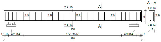 Dimensions and arrangement of rebars in the RC beams (dimensions in cm).