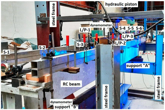 The RC beams were loaded by a steel traverse, which was symmetrically oriented to the beam’s perpendicular axis and produced load in the form of two concentrated forces 100 cm apart. Force was applied to the steel traverse via a centrally located hydraulic piston. The hydraulic piston applied the appropriate pressure by means of a hydraulic pump. The pressure was increased in steps to obtain the specified value of the force in the piston. Reinforced concrete beams were loaded with step force increments of 5 kN or 10 kN. A force gauge was mounted between the hydraulic piston and the steel traverse in order to double verify the current value of the load on the tested elements. The test specimens were positioned on the horizontal steel frame and pivotally supported at two points 320 cm apart along the axis.