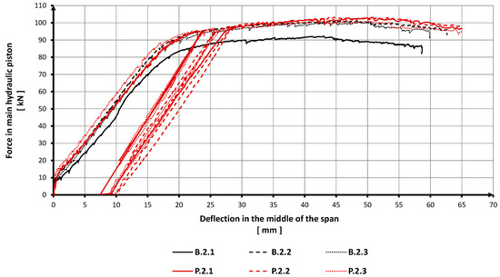 The application of the polyurea coating on the RC beams made it possible to perform an unloading/loading cycle on the test specimens; the unloading point was set at 90% of the breaking force found for the uncoated reference beams. This is the crucial difference between the coated beams and the uncoated reference beams under load. When the load exerted on the specimens (P.2.1–P.2.3) reached 90% of the breaking force for the reference beams, it was relieved and restored; after that, the specimens exhibited the original bending strength (the strength before the unloading/loading cycle). The secondary strength (the bending strength after the unloading/loading cycle) of the polyurea-coated RC beams was achieved without any excess increase in the deflection of these elements, i.e., without any loss of bending stiffness (Figure 8).