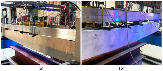 Beams under loading—views along the elements: (a) A beam without the polyurea coating; (b) a polyurea-coated beam.