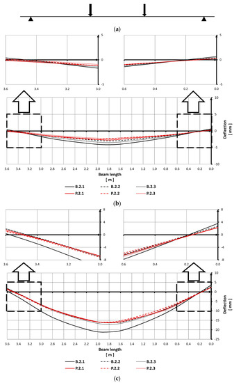 The analysis of the curves displayed in Figure 10 indicates that the values and curves of the displacements in five out of six of the RC beams tested are comparable. It can be seen that in the initial phase of loading, when beam stiffness mainly depends on the properties of concrete, the displacements of the coated beams are smaller than those of the reference specimens (Figure 10b,c). The differences in the curves of strains in the specimens disappear under a higher load, i.e., when the beam stiffness is related to characteristics of the reinforcing steel. The diagrams show that the displacements of beam B.2.1 are the largest (Figure 8 and Figure 10). This is due to the fact that this beam was the first one to be tested under a load after the test stand was built, so some strains of this beam are related to the settlement of the test stand structure. It should be noted that the results of the other specimens are stable and coherent.