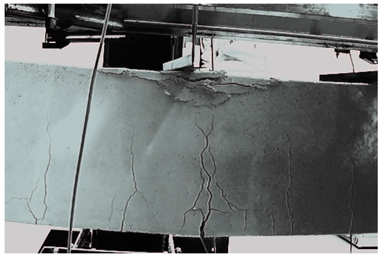 The cracking pattern was observed during the tests on a continuous basis using two cameras from both sides of the RC beams. For selected specimens, the cracking pattern on the surface of the elements was also captured by marking, near each crack, the load value at which it formed (Figure 11). For all the RC beams analyzed, typical bending cracks were recorded, and these tended to develop at the beam midspan.