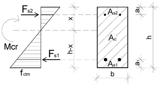 The component (fctm) used in Equations (2) and (3) is the average concrete tensile strength; the section modulus of a rectangular cross-section subject to bending (Wc) was calculated from the expression b·h2/6. The variable (Wcs) is the section modulus of the equivalent section, taking into account the impact of reinforcement on the cross-sectional stiffness. To analyze the values of the cracking moment, the height of the tension area (x) immediately before crack formation in the beams must be determined. To this end, we need to calculate the position of the neutral axis in the equivalent section. First, the steel reinforcement has to be replaced with an equivalent area αeAs, where αe is the ratio of the modulus of elasticity of steel (Es) to the modulus of elasticity of concrete (Ecm), expressed as: