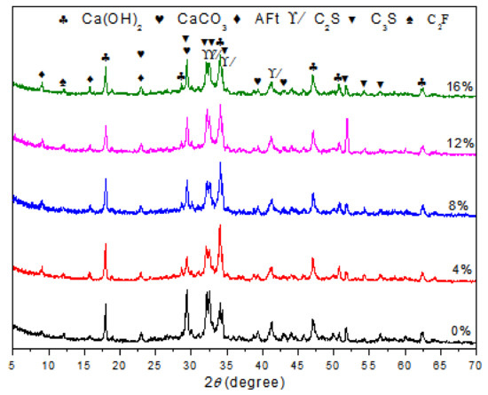 To observe the formation of the hydrates, XRD patterns were recorded at the 28th day for each different polymer/cement ratio of EVA-modified cement paste. The results are shown in Figure 1. It was observed that the characteristic peaks of CH were at 18.08, 34.08, and 47.12°; those of CaCO3 were at 29.40, 39.40, and 43.14°; and those of AFt were at 9.09, 15.78, and 22.94°. These results showed the typical hydrated products in hardened cement paste and were consistent with the results from other researches [24,25,26,27]. Although the peak intensity of CH was not directly proportional to the content of CH in hardened cement paste, the content of CH generation could be viewed as an indicative description for the variations in phases upon EVA [28,29]. It was noticed that the peak intensities of CH at around 18.04° presented a slight decrease as the content of EVA increased. The peak intensity was usually related to the content of the corresponding mineral phase. This result showed that the addition of EVA polymer caused a minor delay to the hydration process of cement and reduced the formation of CH.