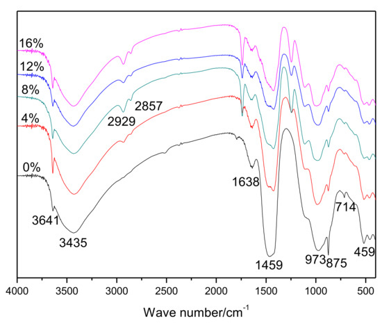The results of the FT-IR spectrophotometry of hardened pastes are shown in Figure 2. An interesting result was observed in that the bands at 2929 cm−1 and 2857 cm−1, which are associated with the EVA [25], gradually became stronger as more polymers were added. The bands at 3641, 1459, and 714 cm−1 were related to the presence of CH [26]. The band at about 1638 cm−1 was related to the formation of Aft [30], and the bands at 973 cm−1 and 875 cm−1 were attributed to hydrated calcium silicates [31] and carbonate [31], respectively.