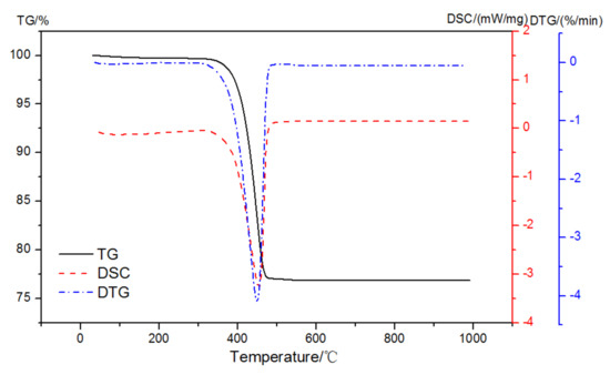 The mass loss and DSC curves of analytically pure Ca(OH)2 in pure N2 gas dynamic atmosphere are shown in Figure 4. There was only one prominent peak observed at 350~500 °C that was related to the dehydroxylation of Ca-OH according to Equation (1):