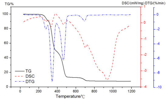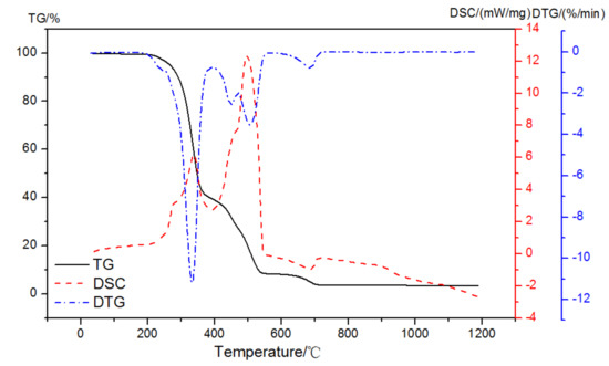 To prevent an endothermic and an exothermic process appeared at the same time, a dual atmosphere was used. With an oxidizing atmosphere up until 420 °C and then a pure nitrogen to 1000 °C with the purge gas at a flow rate of 50 mL/min, the TG-DSC-DTG result of EVA in dual atmospheres is shown in Figure 7. There were three distinct regions in the heating of the pastes: up to 420 °C in the process of an exothermic reaction with the reaction enthalpy of 697 J/g; then, the pyrolysis reaction of EVA took place in the nitrogen atmosphere, and the mass loss was 12.06% between 420 and 510 °C; and, finally, it turned to the range of 620~740 °C with 4.70% mass loss. The content of EVA and the corresponding weight loss could be calculated according to the exothermic peak of the oxidation reaction in the air atmosphere up to 420 °C.