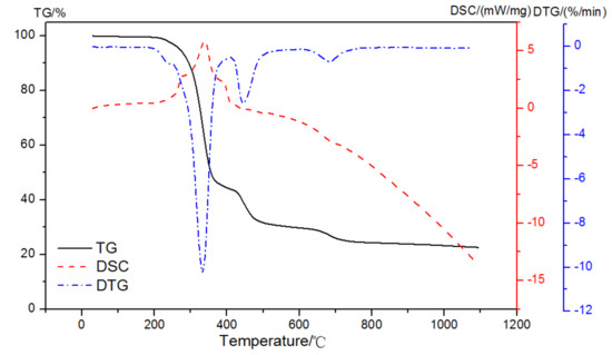 The simultaneous thermal analysis (TG-DSC) was performed with a type of STA 449C (NETZSCH, Selb, Germany) to measure the mass changes and caloric data. It was operated at a constant ramping rate of 10 ℃/min. A dual atmosphere was proposed, first in an oxidizing atmosphere until 420 °C was reached and then in pure nitrogen to 1000 °C, with the purge gas at a flow rate of 50 mL/min. Crucibles were made of aluminum oxide.
