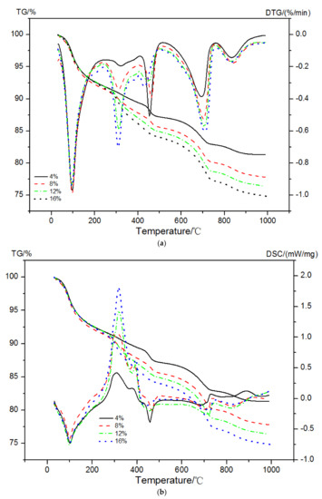 Hardened cement paste is a composite material whose properties ultimately depend on the components and their spatial relationship to each other. Calcium silicate hydrate (C-S-H) gel, Ca(OH)2, ettringite (AFt), and monosulfoaluminate (AFm) are important hydrated products and components of hardened cement pastes [1,2,3,4,5]. They play a crucial role in the various behaviors of hardened cement paste, such as strength and durability. In order to acquire the desired properties, it is important to characterize and quantify these hydrated products of the hardened cement paste, especially for those with various chemical and mineral admixtures. Calcium hydroxide is the second major component of hydrated Portland cement, and it was shown that the percentage of Ca(OH)2 is linearly related to the hydration of cement [6,7,8]. Therefore, the hydration degree and the impact of the admixture could be described based on the quantity of formed Ca(OH)2. Many studies have been performed on the quantitative analysis of calcium hydroxide (CH) content of cementitious materials [7,9,10,11,12,13]. common methods include chemical extraction, simultaneous thermogravimetry and differential scanning calorimetry (TG-DSC), X-ray diffraction (XRD) methods, etc. The chemical extraction method [14,15] is frequently used for its simplicity and reliability. In recent years, thermal analysis and XRD have been widely used in the content analysis of CH. Ramachandran VS [16] tested the content of CH by separately using chemical extraction and thermal analysis. In his work, a remarkable difference in the content of CH with an increase in cement age was found due to erosion of the extraction agent to C-S-H gel. Although XRD is a commonly used quantitative method, its main disadvantage is that it is only sensitive to crystals, ignoring the existence of some amorphous CH powder in the cement hydration products. In addition, as a hexagonal tabular crystal, the test results interfered with the preferred orientation of CH [17,18]. Zhang TL [19] proposed that the content of CH can be analyzed by thermogravimetry combined with differential scanning calorimetry. The method is rapid and convenient, and the test results were stable and accurate as the environmental and artificial factors were negligible. Although TG-DSC is an effective method in the quantitative analysis of the content of CH, some deficiencies exist, for example, in the hydration products of polymer-modified cement, the negligence of overlapping of the polymer decomposition weight loss peak and calcium hydroxide dehydration peak would introduce experimental error.