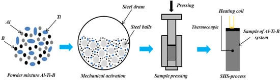 Figure 1 shows the Al-Ti-B powder mixture sample preparation process. Powders of titanium (OJSC Polema, Tula, Russia) (average particle size of 140 μm) and boron (OJCS Aviabor, Dzershinsk, Nizhny Novgorod region, Russia) (average particle size of 0.6 μm) were mixed in a stoichiometric ratio to obtain titanium diboride (Ti + 2B → TiB2): 69 wt.% Ti + 31 wt.% B []. Aluminum powder (Sual-PM Ltd, Shelkhov, Irkutsk region, Russia) (average particle size of 100 μm) was added to the obtained mixture at a ratio of 70 wt.% of the total mixture.