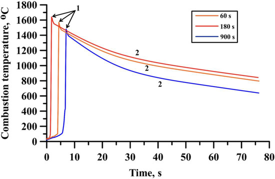 Mechanical activation for 900 s leads to a change in the combustion nature of the system (Figure 2b). Two foci are observed on the lateral surface, which move towards each other (region 4). Under the flame front, a heating zone is formed (region 5), in which a new nucleation site for reaction appears. The nucleation site for reaction spreads over the sample in the form of two waves moving in opposite directions. We found that the thickness of the heating zone and the flame front in this case is greater than in the samples, the mechanical activations of which were 60 and 180 s. Such a combustion regime is characterized as a limiting one, after which attenuation occurs [].