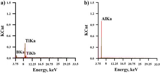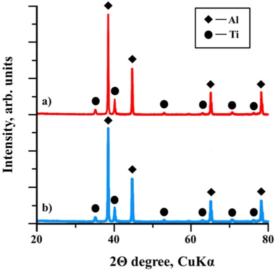We found that the powder mixture contained Al and Ti phases both before and after mechanical activation. It should be noted that no reflections belonging to the boron phase were found in the XRD pattern, since amorphous boron powder is characterized by the presence of short-range order in the mutual arrangement of its atoms [], which makes it impossible to classify it as a crystalline phase.