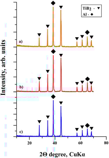 It was found that all SHS products contain phases of titanium diboride (TiB2) and aluminum. The crystal lattice parameters of the presented phases do not qualitatively differ from each other and are close to the lattice parameters of the reference phases of aluminum and titanium diboride [,]. The obtained results show that mechanical activation does not affect the formation of new phases in the powder mixture.