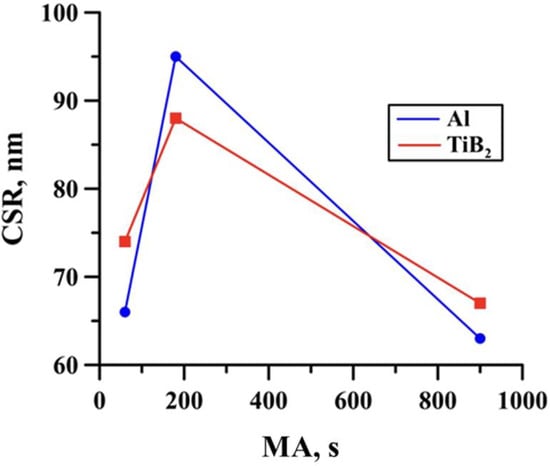 The phase contents in the obtained SHS products also do not qualitatively differ from each other and correspond approximately (considering the error of the diffractometer 3–5%) to the mass ratio of the components in the initial mixture. It was also found using X-ray scattering that mechanical activation affects the size of the coherent scattering regions (CSRs) in the SHS products. Figure 6 shows the dependence of the CSR size of the TiB2 and Al phases on the mechanical activation duration of the initial mixture. This dependence is related to the reaction temperature of the Al-Ti-B samples. The size of the CSRs characterizes the size of the crystallites in the materials []. In addition, [] suggests that an increase in the synthesis temperature leads to the growth of crystallites in the material. Consequently, mechanical activation of the Al-Ti-B mixture for 180 s leads to the maximum value of the Al and TiB2 crystallite size, as well as the CSR size of these phases.
